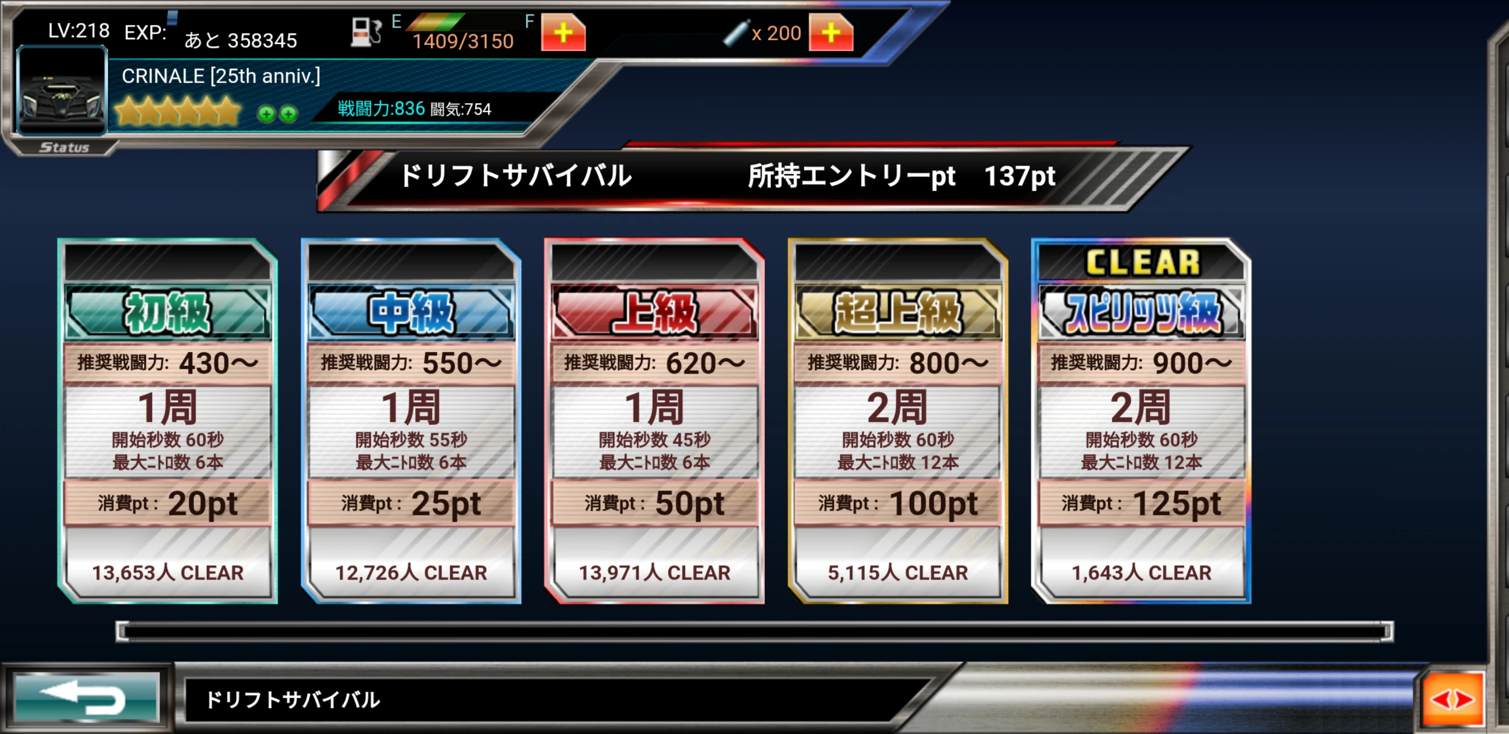 Survival Race (also known as SR, previously DS a.k.a Drift Survival) is an event where you race on a circuit track while trying not to run out of time by scoring Excellent/Spirits combos while also trying to beat the other car. You earn Battle Points based on your max combo and Nitrous you used. At the start you need to gather entry points to participate for the 5 difficulties:
