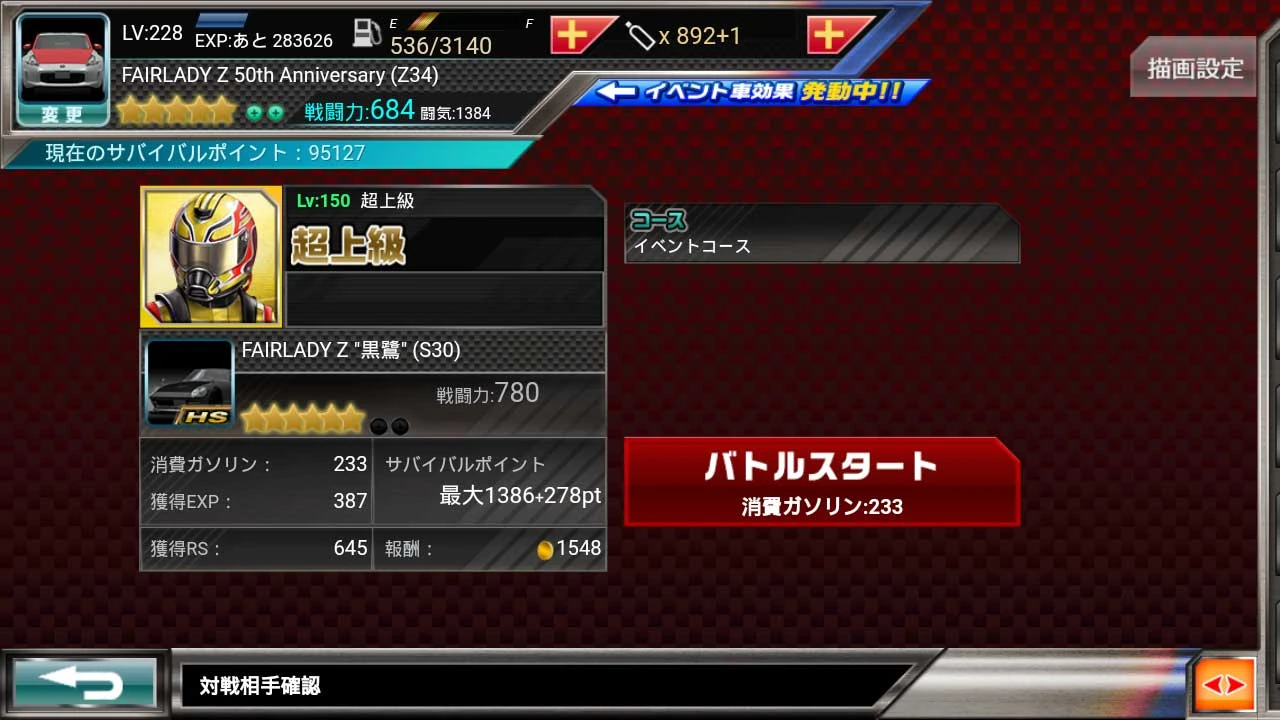 Every day you will receive 100pt as part of the login bonus. To earn Entry Points you need to do any race outside of the event. Normal gas usage races earn about 30 - 40pt and double gas usage races earns double the amount. Cars and Companions that provide a bonus will increase the amount of Entry Points you earn, as well as Battle Points. After you've selected a difficulty you'll have a chance to see the opponent before you race. Each entry and exit of a corner earns you more time. The added time is determined by if you get a late, early, Good or Excellent/Spirits, in that order less to more.