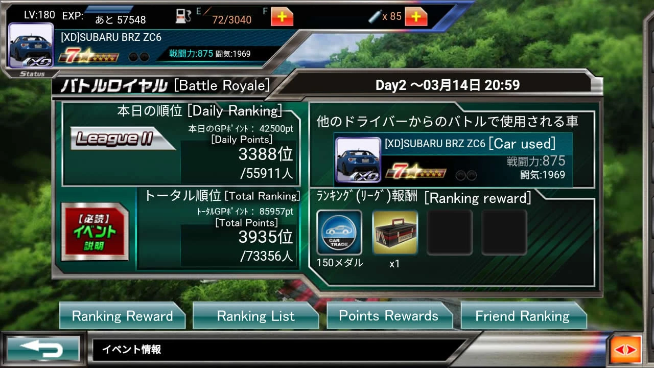 In Battle Royal (also referred as BR, previously GP) events you battle other players that are participating in the event to get points. You obtain points for defeating an opponent. Like the Boss Battle states, opponents will either appear in the following states: Normal, Serious/本気 (Uses 1 NOS), Super Serious/超本気 (Uses 2 NOS) or Possessed/覚醒 (Uses 3 NOS). Opponents will use set NOS spots on each track according to how much NOS they use. There is also a Power Down state (Purple) in which the opponent has their car's power reduced (usually around 400 Power). This state gives out less points than a normal opponent. The more points you obtain, the higher the league you will be placed in. The rankings are measured daily, with the last day using your final rank to determine what league you are in. BRs last any where between 5-7 days. Battle Royale events has a selection of cars and companions that grant a bonus, multiplying your points based on whether they grant a Low, Medium or High bonus. When racing you have a chance of getting a x1.5 or x1.8 point bonus for 10/15 minutes respectively. This extra bonus is added on top of whatever bonuses you currently have in place. You can also activate a multiplier bonus at any time using Daily Enerjellies or Royal Enerjellies, with Daily Enerjellies granting a x1.8 point bonus for 10 minutes per Enerjelly and Royal Enerjellies granting a x2 point bonus for 15 minutes per Enerjelly. You are given 3 Daily Enerjellies each day of a Battle Royal event, whereas Royal Enerjellies need to be purchased from the shop.
